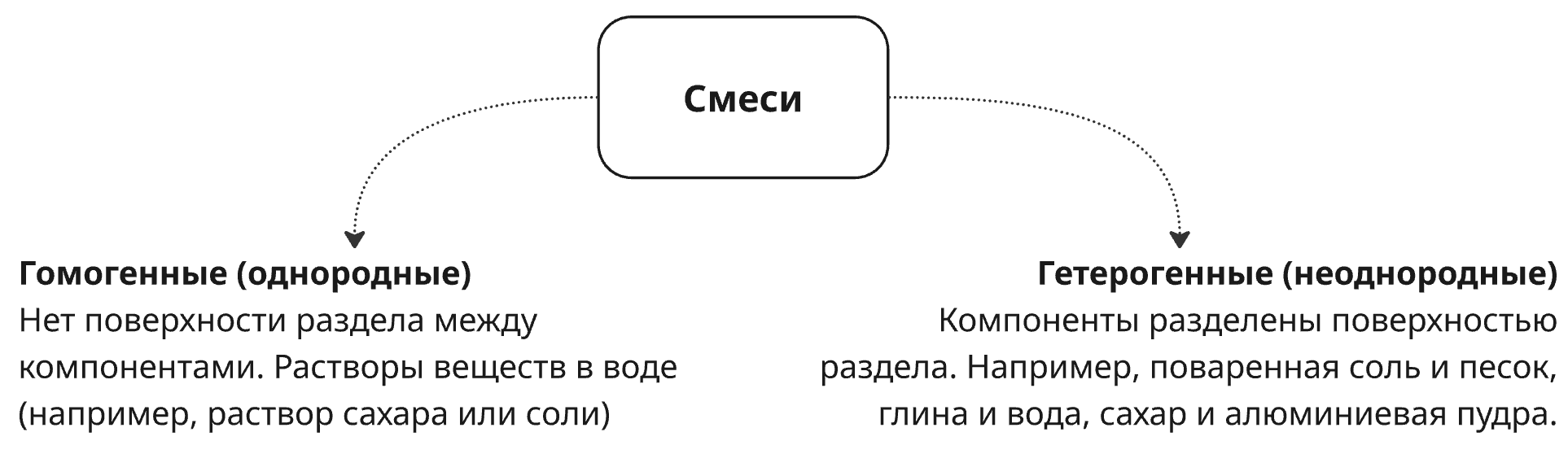 Гомогенными смесями являются, например, смеси газов (воздух), жидкие растворы (например, раствор сахара или соли в воде). Гетерогенные смеси — это смеси твердых веществ (порошок мела и поваренная соль), смеси нерастворимых друг в друге жидкостей (масло + вода), смесь жидкости и нерастворимых в ней твердых веществ (мел + вода).
